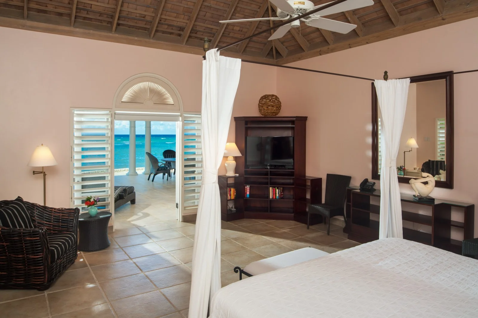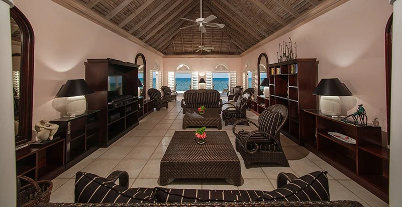The West Wing Living Room is open on 2 sides, with French doors providing access to another extensive veranda and the 2nd private beach.