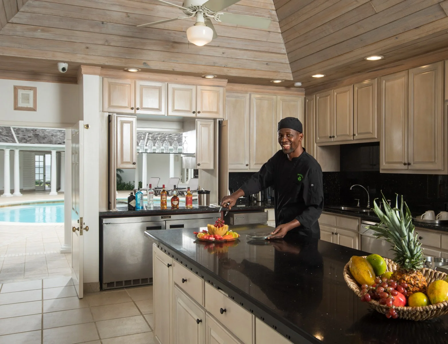 The heart of the home is the vaulted living room. Lovely French doors open to the veranda, while a broad threshold leads to the arched gallery and pool terrace. This superb design allows the sea breeze to circulate through the beautifully furnished lounge, while a Sonos sound system infuses the space with music.