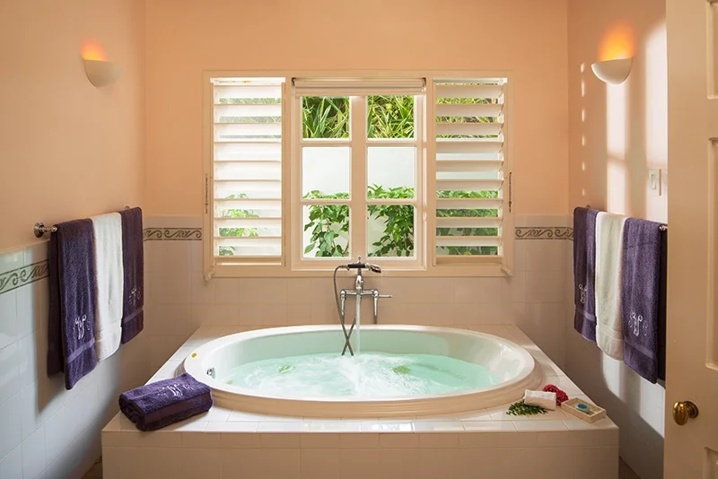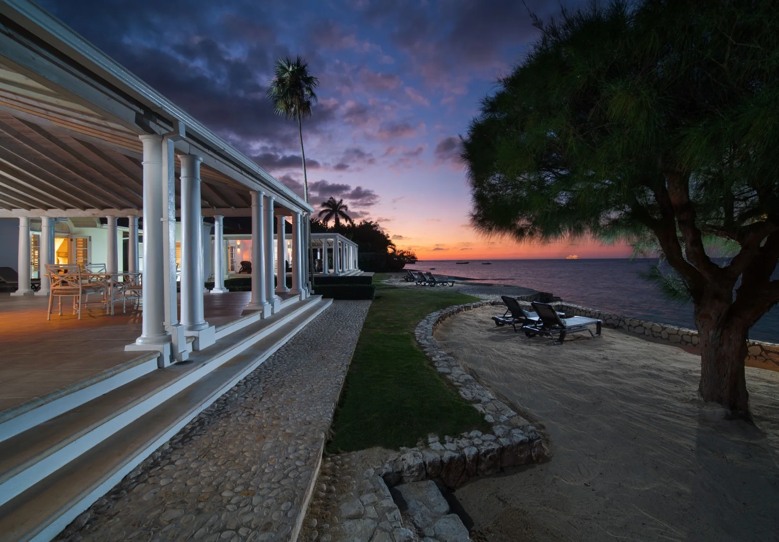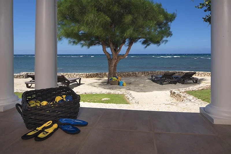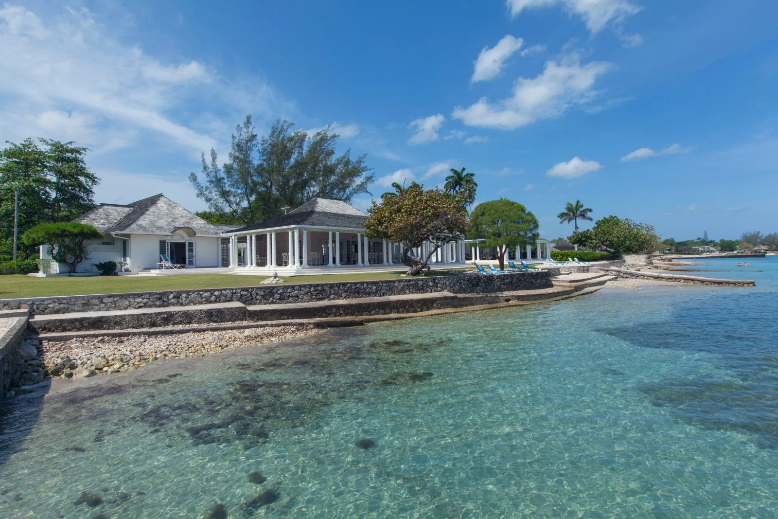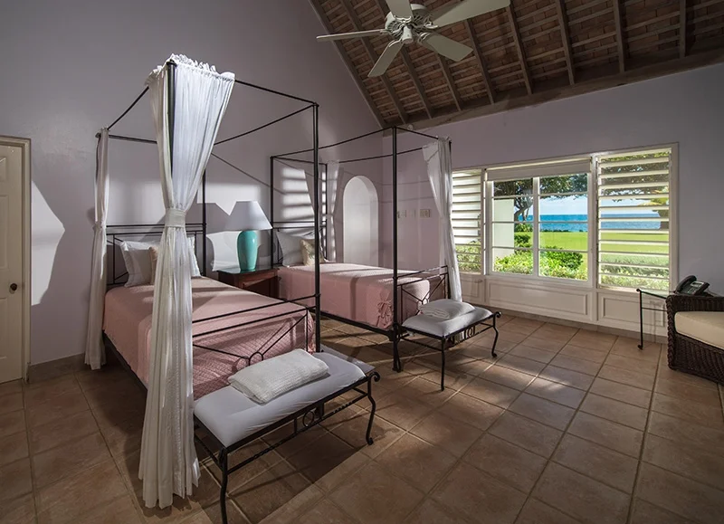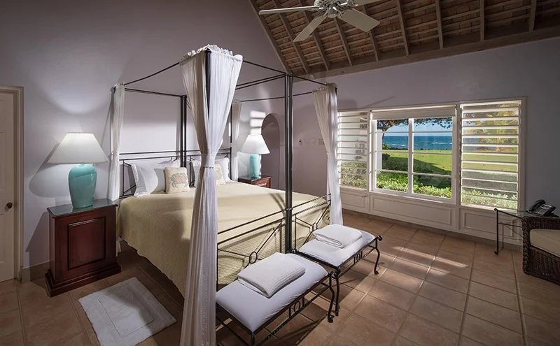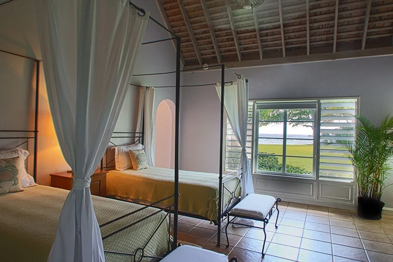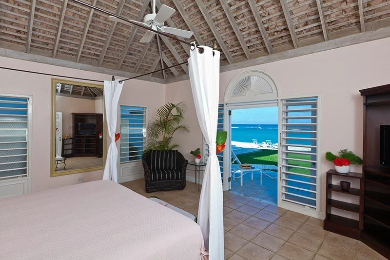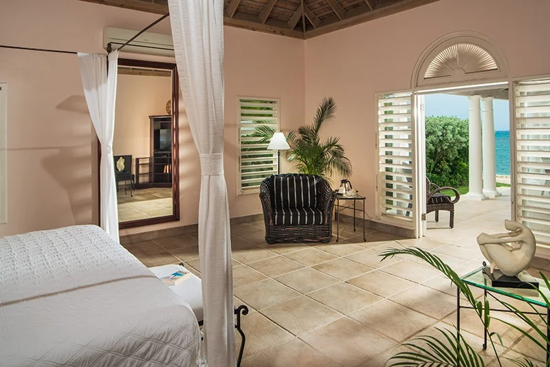 The villa’s stunning design features 2 wings flanking a lovely circular freshwater pool in the central courtyard. Both wings have patios bordering the water, from which guests are invited to snorkel in the luminous, reef-rich waters. Elegant lounge chairs invite you to bask in the Caribbean sun, while a beautiful Casuarina tree casts soothing shade on your afternoon idylls. The veranda offers a vintage Jamaican atmosphere for alfresco meals and sunset cocktails.