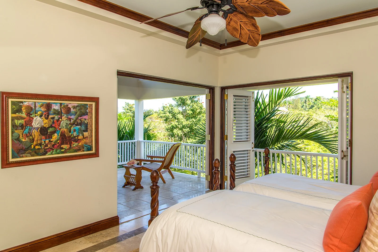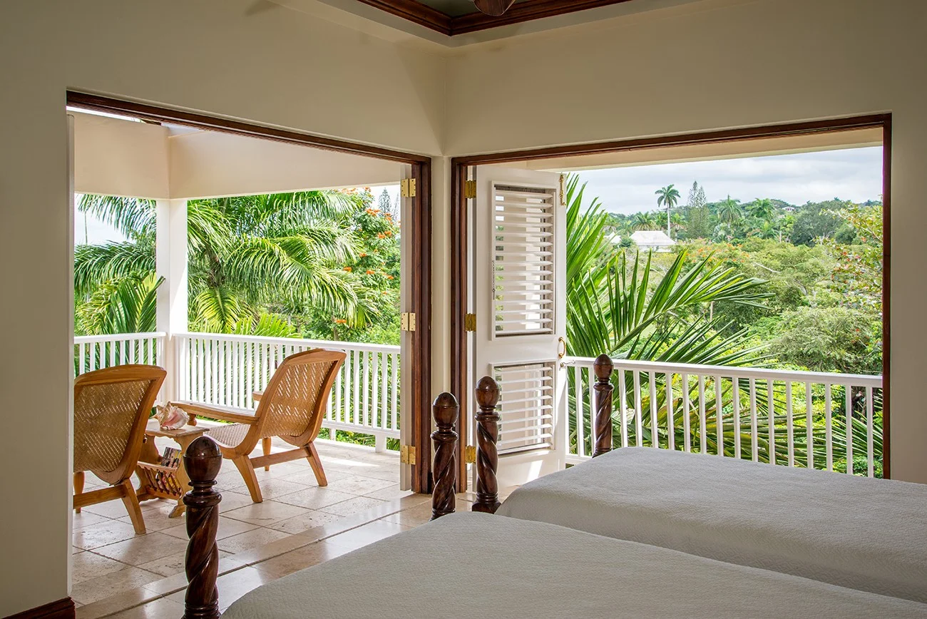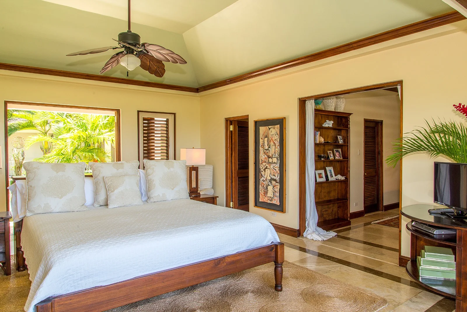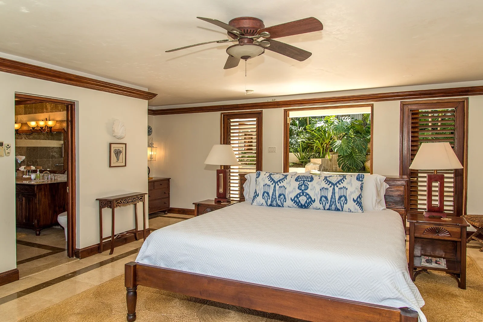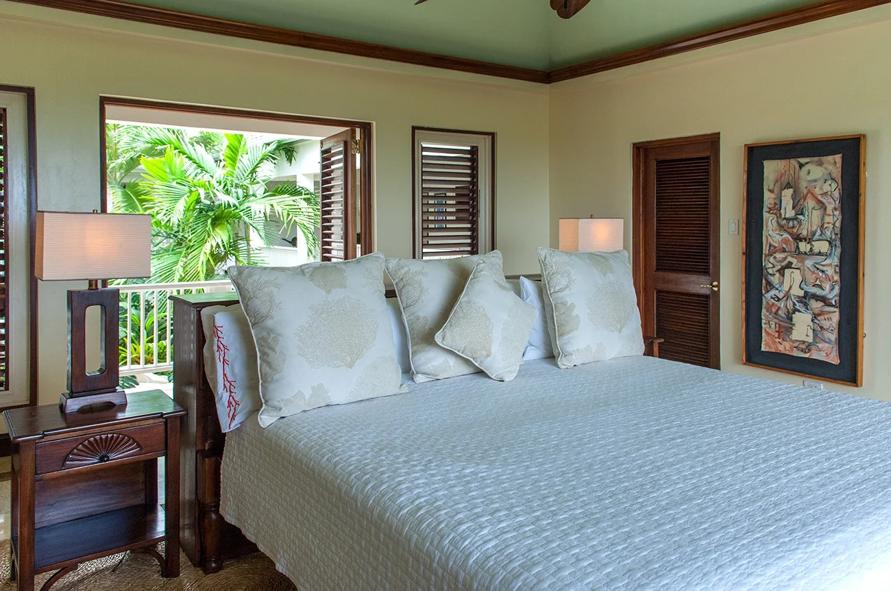 King bed, adjoining den, walk-in closet, ensuite bathroom with rainfall shower over deep bathtub. Louvered windows open from bathtub and shower to garden and sea view.