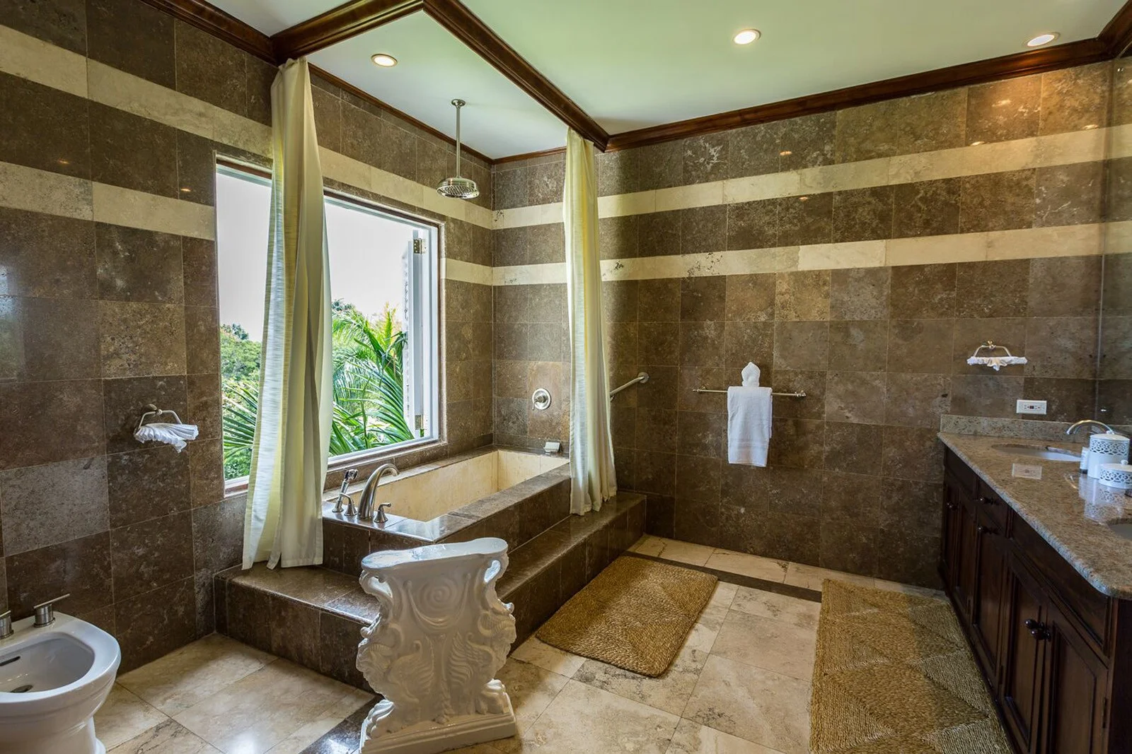 While the two Primary Bedrooms (Coral and Blue Rooms) each come with adjoining office alcove and deep marble bathtub, all bedrooms are virtually identical and luxurious.