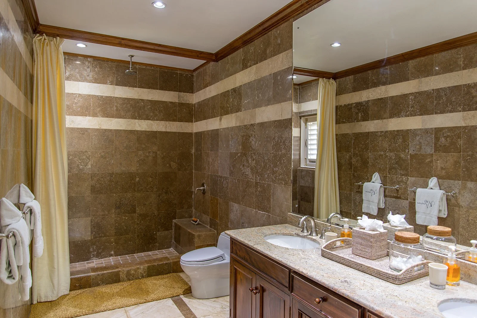 Sienna Room has optional King or Twin beds, cove lighting, wrap-around balcony with view over the golf course to the sea. The ensuite Travertine marble bathroom has a walk-in shower with rainfall shower head.