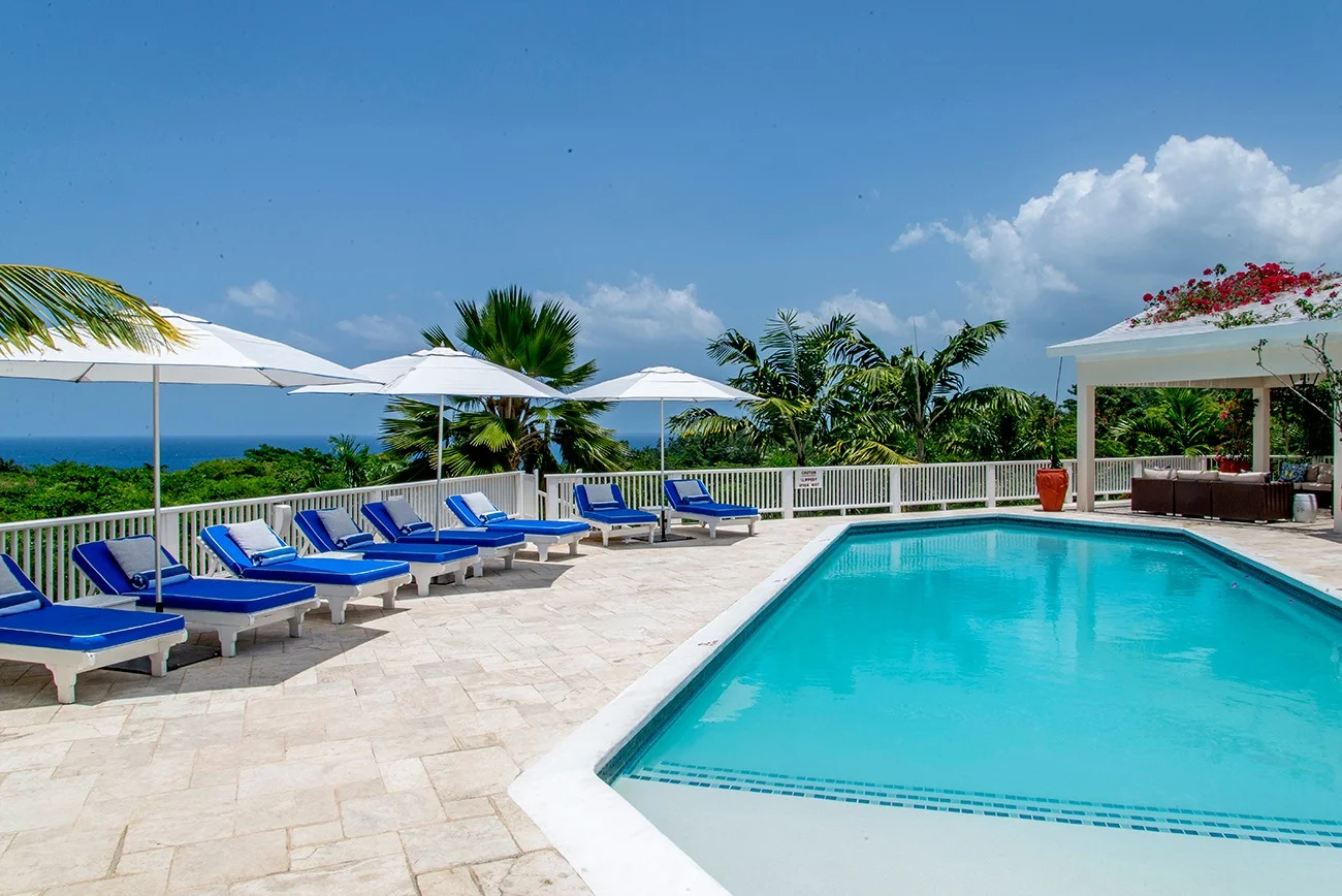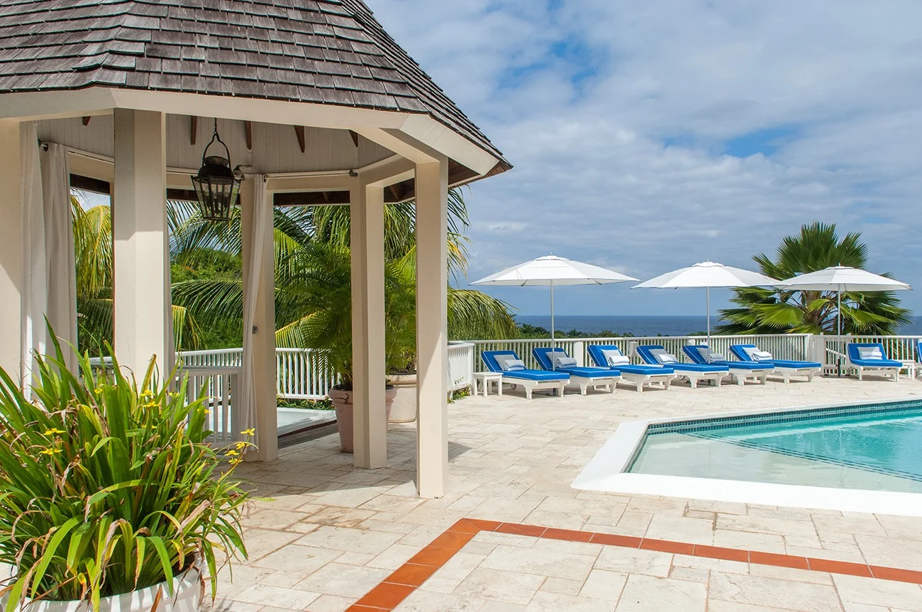 The heated swimming pool is entered via a non-slip ankle-deep kiddie section. Just beyond, 3 steps lead down to a 3-foot depth. Wonderful for children. Maximum depth at the far end is 5 feet. The Jacuzzi celebrates the best of outdoor living with a deck overlooking the sea. From the pool terrace, a spiral stairway leads up to a dreamy loft with a wet bar, king-sized deck bed and magnificent sea view, perfect for travel-weary vacationers to nap or for stargazers to enjoy the night sky.